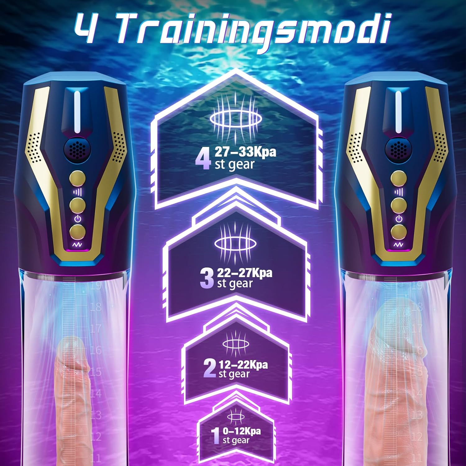 Wähle zwischen vier Intensitätsstufen und Trainingsprogrammen zur Förderung der Durchblutung. Die realistische Saugfunktion simuliert intensive Stimulation. Dank integriertem Sicherheitsventil kannst du den Druck jederzeit sofort ablassen.
